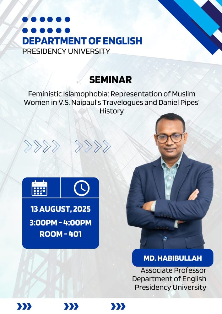 Md. Habibullah will present his own research paper titled βFeministic Islamophobia: Representation of Muslim Women in V.S. Naipaulβs Travelogues and Daniel Pipesβ Historyβ. The paper explores how feminism, when co-opted to stereotype Islam as inherently patriarchal, may contribute to Islamophobiaβan idea examined through Naipaulβs Among the Believers and Beyond Belief, alongside Daniel Pipesβ In the Path of God.